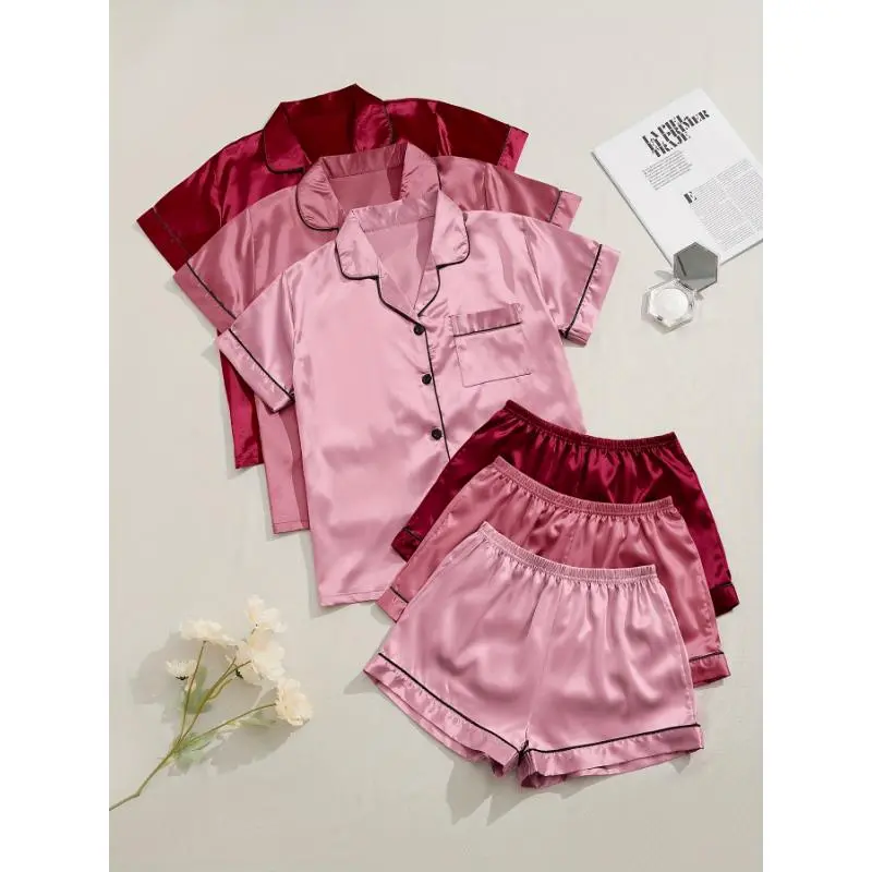 3 sets 3-Piece Satin Pajama Set for Women: Short Sleeve Lapel Top & Elastic Waistband Shorts Loungewear Nightwear Casual Fabric