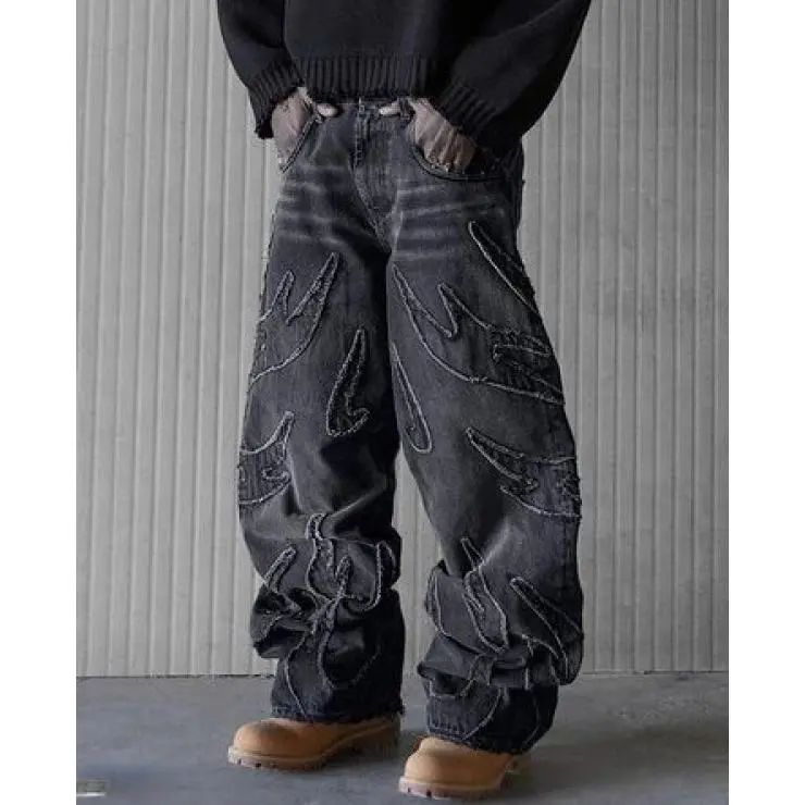 Baggy Jeans for Men Hip Hop Distressed Retro Black Pants Oversized Embroidery Harajuku Wide Leg Trousers Streetwear Menswear Beige