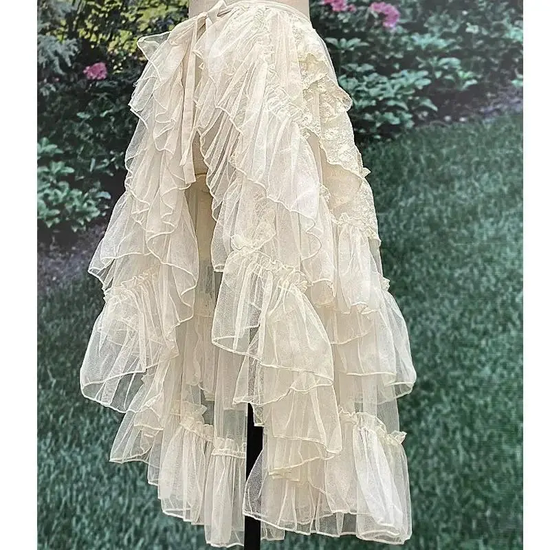 Double Layered Lolita Waist Curtain Sheer Cover Up High Low Skirt w. Asymmetrical Ruffles