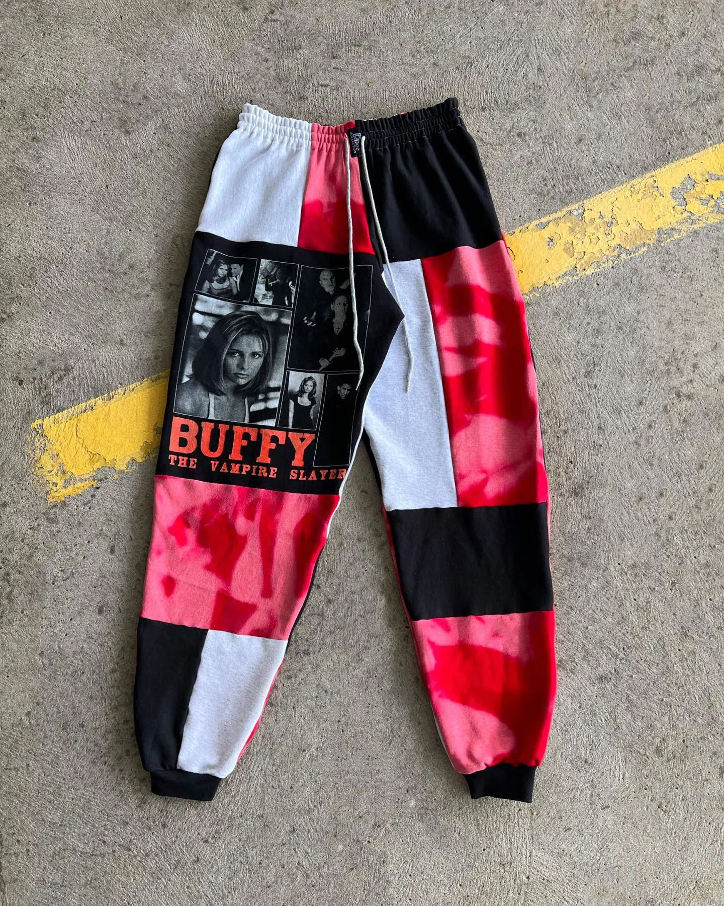 Horror character patchwork jogger pants in vintage Halloween style, sustainable streetwear for fall nights..