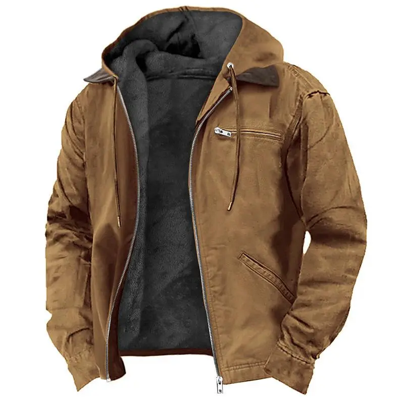 Solid Color Hooded Cotton Jacket Casual Men’s Fleece Lined Zipper Pocket Jacket Coat Menswear Tops