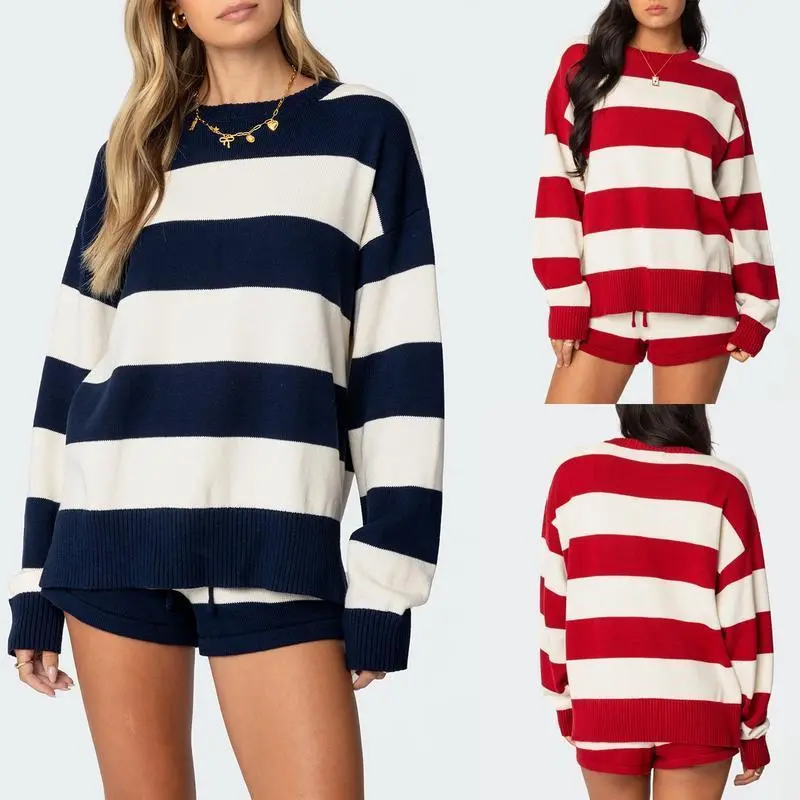 Women Striped Knit Sweater Set 2 Piece Outfit Oversized Long Sleeve Sweater and Shorts Matching Lounge Sets Chic Elastic