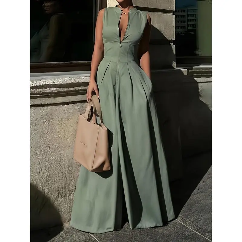 Women’s 2025 Waisted Wide Leg Jumpsuit – Loose Fit V-Neck Zipper Front with Pockets, Sleeveless Solid Color (Black/Green/White) Fitted Vneck Overalls Womenswear Minimalist Basic