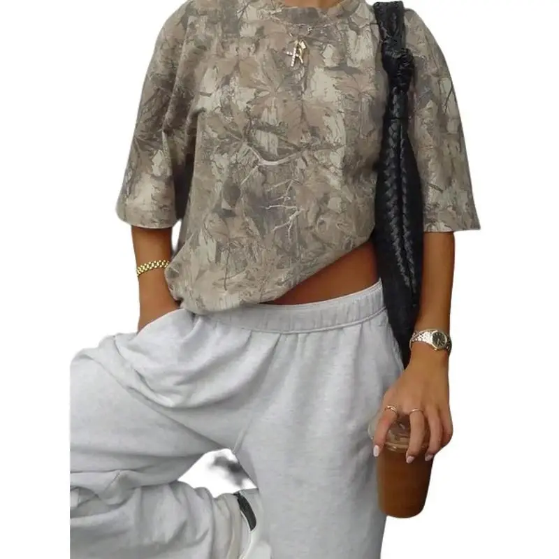 Women’s Casual Loose Camouflage Print Short Sleeve T-Shirt Top Summer Fit Green Womenswear Comfort Tshirt Fabric Streetwear Pocket Crewneck Shortsleeve