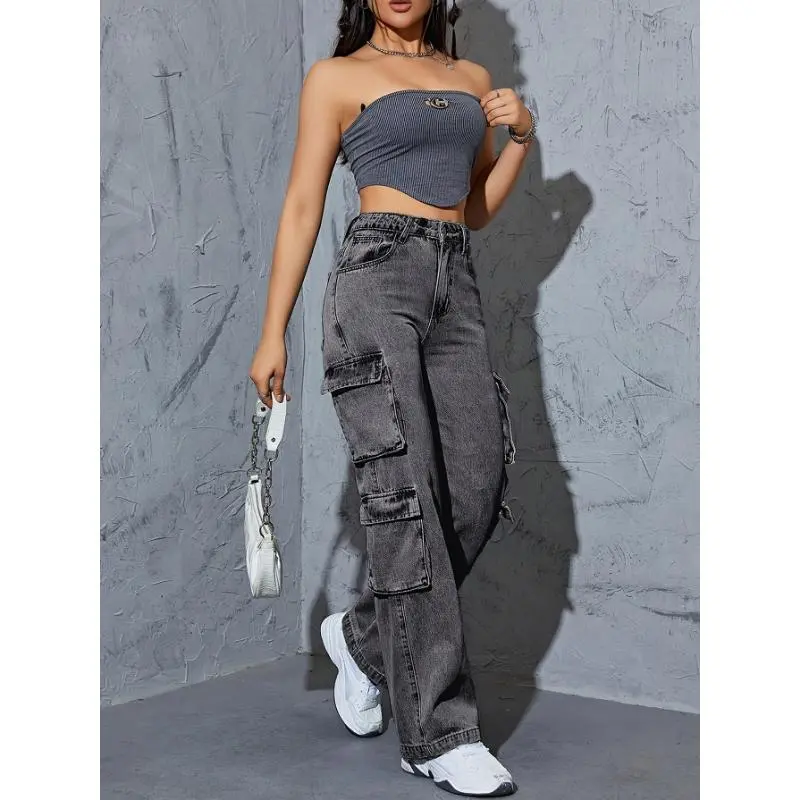 Women’s High-Waist Cargo Jeans in Dark Gray Washed Stretchy Loose Fit with Side Pockets Casual Streetwear Bottoms TK871139 – Comfort