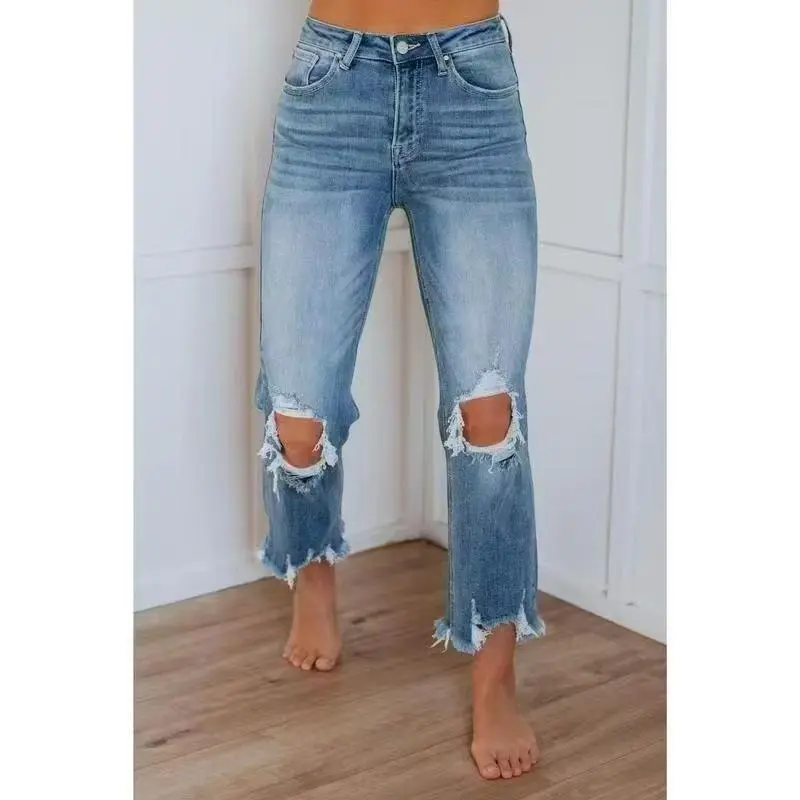 Women’s Jeans – Vintage Black Crop Fit High Waisted Ripped Casual Fashion Denim
