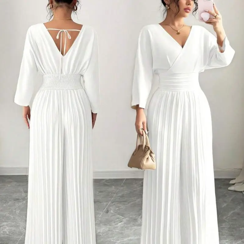 Women’s Solid Color Crossed V-Neck 3/4 Sleeve Ruffle Wide Leg Elegant Jumpsuit Overalls Womenswear
