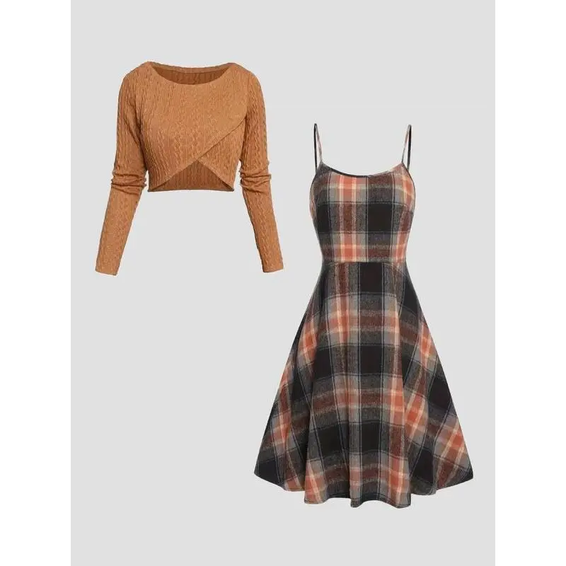 Women’s Solid Wrap Hem Round Neck Textured Long Sleeve Crop Top & Plaid Print A-line Dress Suits Set, Preppy Fashion Comfort Skirt Set for Women’s Clothing for Fall, Womenswear, Teacher Outfits 2024 Dresses School Outdoor Spring Casual